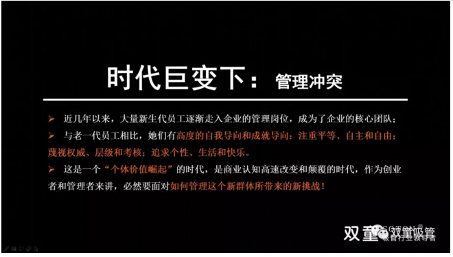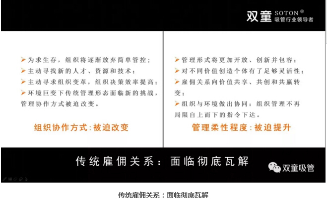 與此同時,民企也面臨著“經(jīng)理人老化”、“企業(yè)二代傳承”兩座大山。在這樣的新時代背景下,管理進入了信息管理時代,傳統(tǒng)雇傭關(guān)系面臨瓦解,管理協(xié)作方式改變,管理柔性程度被迫提升,員工與組織的雇傭關(guān)系逐漸變成了共生關(guān)系!管理形式將更加開放、創(chuàng)新并包容,對不同價值創(chuàng)造的個體就需要有足夠的靈活性,傳統(tǒng)雇傭關(guān)系逐漸向價值共享、共創(chuàng)和共贏轉(zhuǎn)變!