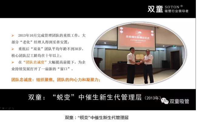 “雙童”選擇了主動“蛻變”:基于上述瓶頸,公司在2011年發(fā)布了第三個《企業(yè)五年發(fā)展規(guī)劃》,明確“再造經(jīng)理人”計劃,明確領(lǐng)導層更替:選拔培養(yǎng)年輕領(lǐng)導層、重要崗位領(lǐng)導年輕化、明確實施股份制改革,慢慢解決管理層老化問題!重組后的“雙童”團隊平均年齡不到三十歲,大部分核心團隊的工齡在十年以上,學歷、知識層次和忠誠度大幅提高!