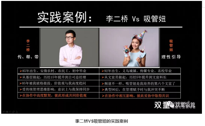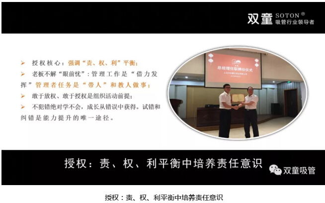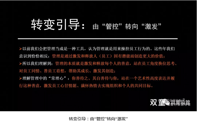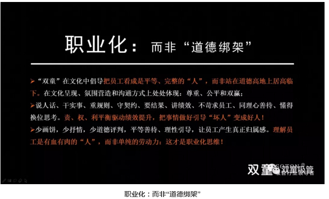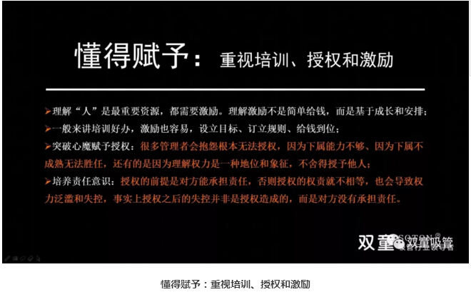 懂得賦予:重視培訓、授權(quán)和激勵:接下來,樓仲平也和大家分享了管理者要理解“人”是最重要的資源,都需要激勵。“雙童”通過學習會意識引導,將員工的學習與職業(yè)升遷掛鉤,將年度學習成績列入其長期職業(yè)發(fā)展當中。在“雙童”,敢于放權(quán)、敢于授權(quán),我們認為員工試錯和糾錯是能力提升的唯一途徑。同時,“雙童”在文化呈現(xiàn)、氛圍營造和溝通方式上處處體現(xiàn):尊重、公平和雙贏,說人話、干實事、重規(guī)則、守契約、要結(jié)果、講績效、不苛求員工、同理心善待、懂得換位思考,責、權(quán)、利平衡驅(qū)動績效提升,讓員工把事情做好引導“壞人”變成好人!