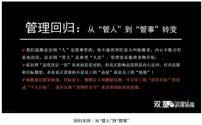 管理的本質(zhì)是“管事”而非“管人”:很多管理者把管理當成一種工具,認為管理是用來操控的,就必須操縱控制員工的行為。其實,“人”是很難管的,你不能死死盯著一個人叫他做事情,員工內(nèi)心不配合盯著他也沒有成效,“管人”是典型“人治”,真正的管理從梳理事物開始。所以,管理不是管控、教條和賦予,而是激發(fā)和釋放每個人的善意,幫助員工成長、激發(fā)其創(chuàng)造,在共同追求中形成一致的價值和理念認同。