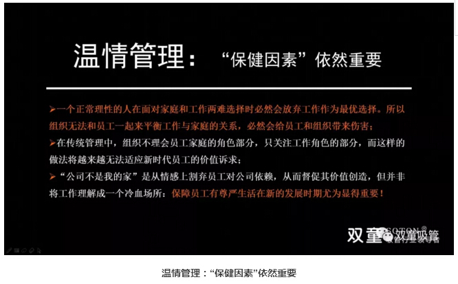 除了授權(quán)和激勵之外,“保健因素”依然重要。一個正常理性的人在面對家庭和工作兩難選擇時必然會放棄工作作為最優(yōu)選擇。“公司不是我的家”是從情感上割棄員工對公司依賴,從而督促其價值創(chuàng)造,但并非將工作理解成一個冷血場所:保障員工有尊嚴生活在新的發(fā)展時期尤為顯得重要!