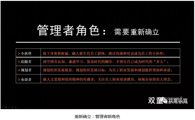 小伙伴:管理者和員工一起平等工作,不要高高在上,放下身姿和權(quán)威,融入新生代員工群體,通過溝通和對話成為員工的小伙伴;