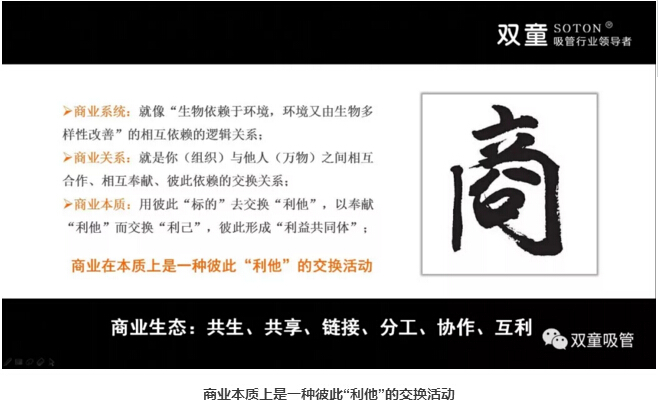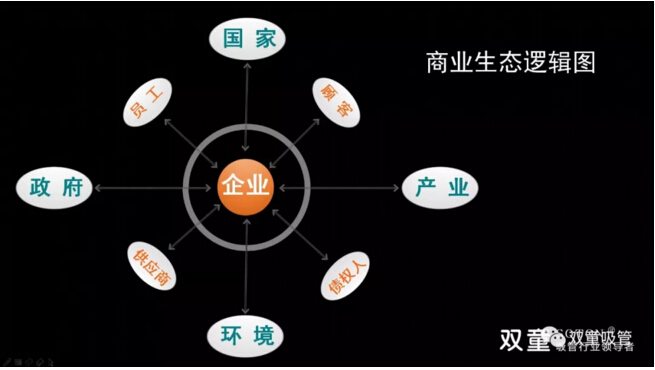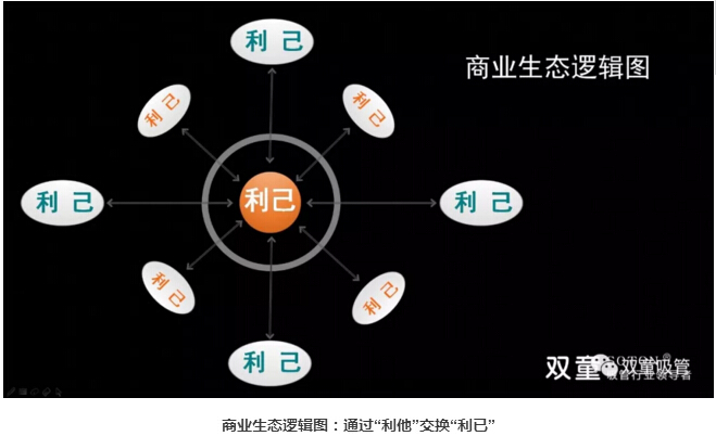 將“商業(yè)的本質”與“人性”剖析清楚后,樓總將一幅商業(yè)生態(tài)邏輯圖展現(xiàn)在大家面前,抽絲剝繭地將商業(yè)邏輯完整地講解出來:人與他人(天下萬物)之間存在彼此交換的過程,你對員工的態(tài)度、對社會的態(tài)度、對環(huán)境的態(tài)度、對資源的態(tài)度、對他人的態(tài)度(包含競爭對手),換取了“他人”對你的態(tài)度,這也是利他的背后一定是利已的商業(yè)本質!