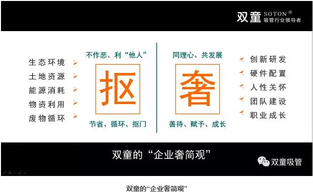在商業(yè)本質的認知下,“雙童”形成了自己獨特的企業(yè)“奢簡觀”:公司在建廠之初建設了雨水收集、廢水處理、垃圾回收等節(jié)能降耗設施,通過這樣創(chuàng)新的方式把生產做到了零排放。與此同時,建設花園式工廠,提高土地利用率,對能源、物資追求產出最大化,對廢物不斷循環(huán)利用,從而每年“摳”出數(shù)百萬元,“奢侈”地用在創(chuàng)新研發(fā)、硬件配置以及對員工的人性關懷、團隊建設上,和團隊一起共發(fā)展!