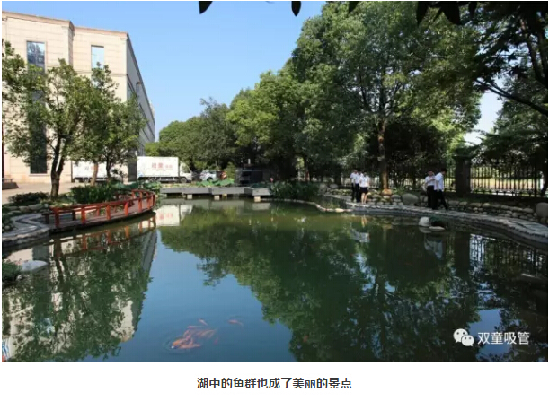 “雙童”人最喜歡駐足停留的便是行政樓前的中水景觀湖了,景觀湖將樹木、花朵、小橋、流水融合在一起,一旁的樹木搖曳風姿,湖水在陽光的照耀下顯得格外美麗!