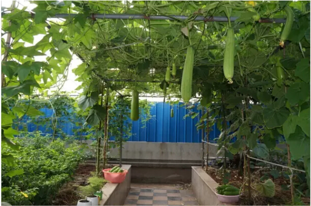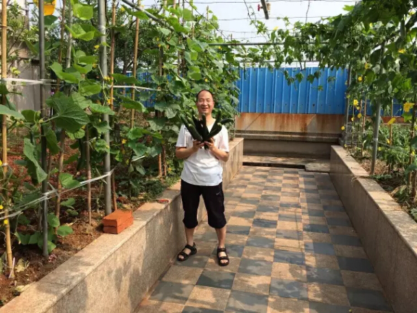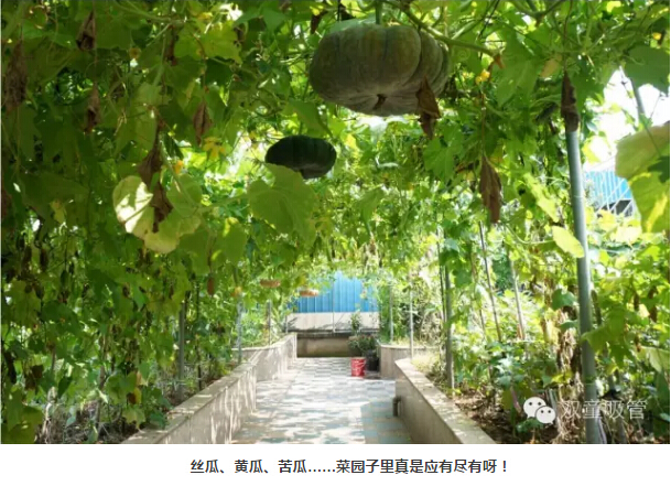“雙童”的屋頂菜園有700多平方米,種著二三十種蔬菜!南瓜、絲瓜、苦瓜、冬瓜、辣椒…… 菜園子里的蔬菜真是應(yīng)有盡有,自家種的菜,在眼皮子底下發(fā)芽成長,開花結(jié)果,安全放心!