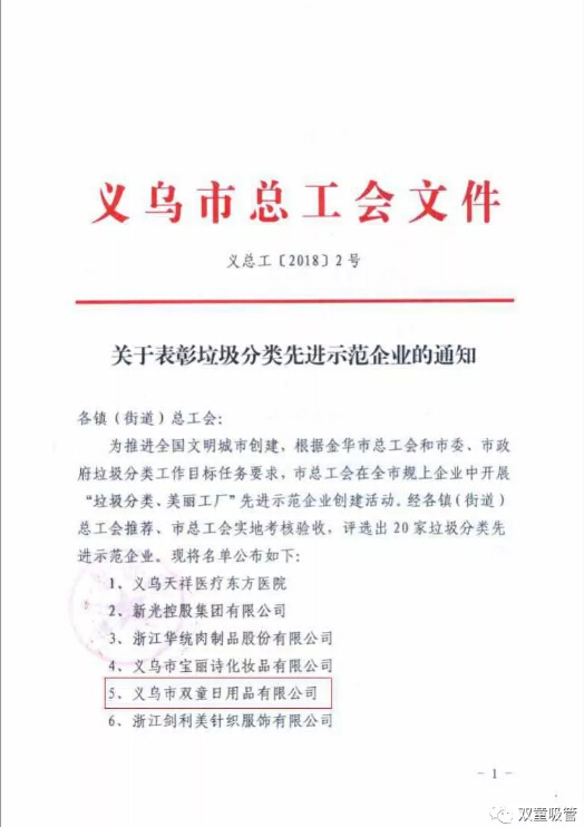 2017年年底,義烏市總工會開展了“垃圾分類、美麗工廠”先進示范企業(yè)創(chuàng)建活動。近日,總工會通過考核驗收共評選出20家垃圾分類先進示范企業(yè),“雙童”就是其中之一。其實,早在2009年,“雙童”就吹響了企業(yè)節(jié)能降耗最后一“戰(zhàn)”——“垃圾分類”的號角。今天,吸管妞就和大家分享“雙童”在垃圾分類方面的經(jīng)驗,一起來看看吧!