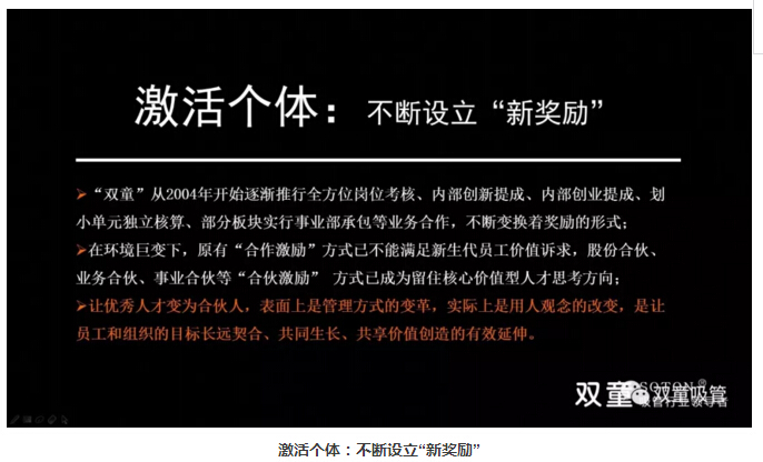在組織機(jī)制上,經(jīng)過一兩年摸索,2017年起“雙童”開始正式推行小單元經(jīng)營,簡單說就是將員工轉(zhuǎn)變?yōu)槔习?。銷售部門最為典型,“雙童”的銷售部門此前按內(nèi)銷、外貿(mào)、電商等分成四五人、七八人的小組,由于分配永遠(yuǎn)不可能絕對公平,激勵(lì)效果存在瓶頸。