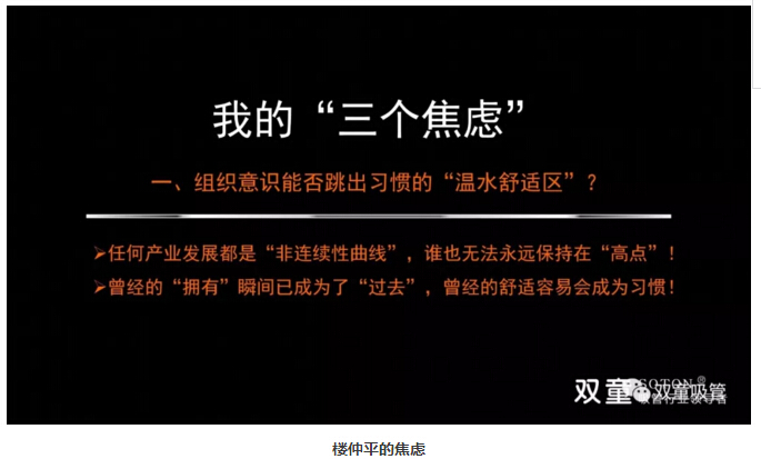 現(xiàn)在的樓仲平不抽煙,不喝酒,只有喝咖啡一個(gè)小小的嗜好,連喝茶對他來說都是過分消磨時(shí)間的奢侈之事。眼下,他最關(guān)心的是如何應(yīng)對“雙童的“三大焦慮”,在舒適區(qū)陷阱與產(chǎn)業(yè)瓶頸之外,個(gè)人夢想與組織夢想的沖突是第三大焦慮的來源,樓仲平面臨再次突破。