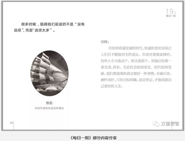有了這本《每日一則》,員工們的晨讀活動(dòng)就有材料啦!俗語說:“書讀百遍,其義自見”,通過誦讀活動(dòng),將“雙童”的企業(yè)文化灌輸給員工們,根植于員工內(nèi)心深處,潛移默化地改變?nèi)w員工的思維認(rèn)知!