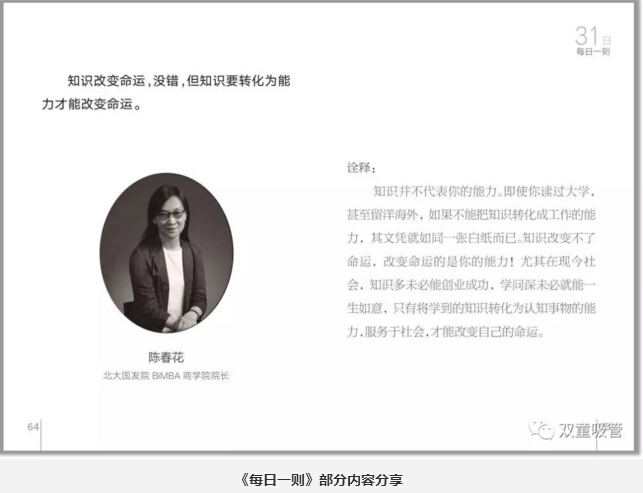 首先,就是晨讀環(huán)節(jié)。“雙童”所有員工在上班之前都會(huì)在統(tǒng)一時(shí)間誦讀“雙童”的企業(yè)文化叢書——《每日一則》。這本《每日一則》里,共收錄了31句名人經(jīng)典語錄,以月度為單位讓員工進(jìn)行重復(fù)誦讀,內(nèi)容包含了專注、創(chuàng)新、共贏、正氣等主題。這可是員工們從幾千條好句里挑出來,并且自己解析的呢!
