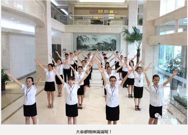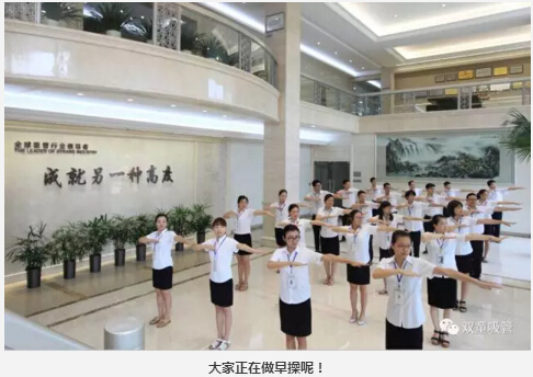 除了精神上要得到提升之外,我們的身體素質(zhì)也非常重要!每天,在晨讀環(huán)節(jié)結(jié)束之后,我們都會(huì)進(jìn)行早操活動(dòng)。俗話說,“一年之際在于春,一天之際在于晨”。在“雙童”行政大廳,員工們列隊(duì)整齊,精神飽滿,氣宇軒昂,伴著豪邁的音樂,用整齊劃一的動(dòng)作做起早操,形成了一道靚麗的風(fēng)景線。