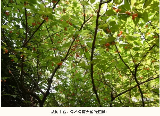 櫻桃樹上綴滿了待熟的櫻桃果,在茂密的櫻葉掩映下慢慢“紅了臉”,散發(fā)出陣陣誘人果香。從樹下往上看,像不像星星掛滿天的趕腳?