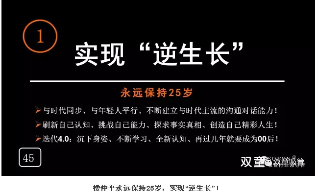 樓仲平認(rèn)為,這個(gè)時(shí)代的主人是年輕人。所以他努力地保持空杯心態(tài),認(rèn)知到不斷發(fā)生的變化,跟年輕人發(fā)生鏈接。在過去的中國歷史中,如果你能說服年長者,年輕人就會(huì)跟隨;而在今天,你只有說服了年輕人,長輩們就會(huì)跟隨你!在這個(gè)時(shí)代,年輕人更能接受新的變化,更能理解新鮮事物,更能獲得新的機(jī)遇。50后、60后、70后們只能更努力地向年輕人靠攏,向年輕人學(xué)習(xí),才不會(huì)被這個(gè)時(shí)代所拋棄。