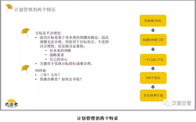 首先,趙宜萱博士和大家分享了“計(jì)劃管理”的定義,計(jì)劃是一個(gè)很特殊的管理手段,它是為實(shí)現(xiàn)目標(biāo)而尋找資源的一系列行動(dòng)。企業(yè)的每一位員工都必須從高管、中層、基層的角度,分別對(duì)企業(yè)戰(zhàn)略、戰(zhàn)略實(shí)施舉措以及行動(dòng)計(jì)劃有一定的理解和定位才能夠做好企業(yè)的行動(dòng)計(jì)劃。“計(jì)劃管理”從制定計(jì)劃開始,到執(zhí)行計(jì)劃,到檢查最終的結(jié)果,是一個(gè)循環(huán)的過程。