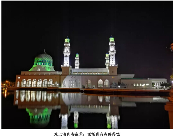 沙巴大學(xué)出來后,我們開著車去亞庇最有名的大茄來海鮮店,途中經(jīng)過了我們白天沒時間去的水上清真寺。原本照片上美麗的藍白清真寺到了晚上,竟然在燈光的效果下變成了綠白色,有點嚇人就是了……我們約定好要在后面白天有空的時候再來打卡。