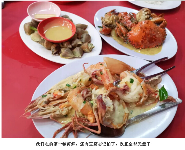 晚上,我們當(dāng)然就在最火的肥媽海鮮樓用餐啦,這應(yīng)該是島上唯一一家不能買海鮮到店里加工的餐廳了,原因是實在太火爆,和大茄來一樣一樣的。味道也是棒棒的,潘大爺對前一晚的招牌豆腐念念不忘,又點了一份肥媽牌招牌豆腐,也是很好吃呢!不過,價格并不便宜,所以我們第二天就自己找當(dāng)?shù)厝速I了海鮮找飯店加工啦!