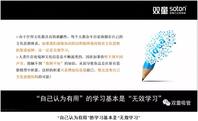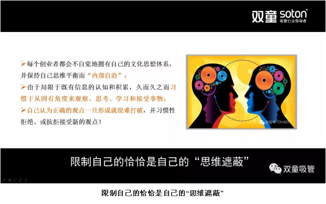 “正是由于任何文化都具有的遮蔽性,創(chuàng)業(yè)者都會不自覺地擁有自己的文化思想體系,并保持自己思維平衡而‘內(nèi)部自洽’。如果我們獲取知識的過程始終保持原有文化思想的渠道延伸,這一定是無效學習。現(xiàn)代知識的構(gòu)架一定是體系化,而非單一通道。如果你聽不到不同聲音,接觸不到‘你所不知’的知識,久而久之習慣于從固有角度來觀察、思考、學習和接受事物。從而導致你總是在原有思想模型中積累,這樣的積累只是增加信息量而已,絕無改變自己文化思想結(jié)構(gòu)的可能!”