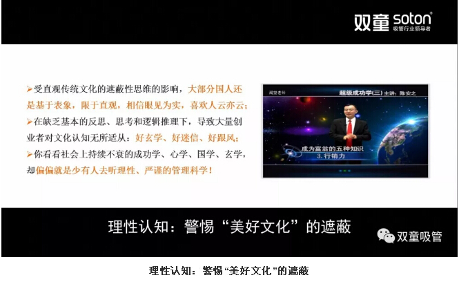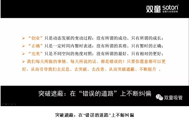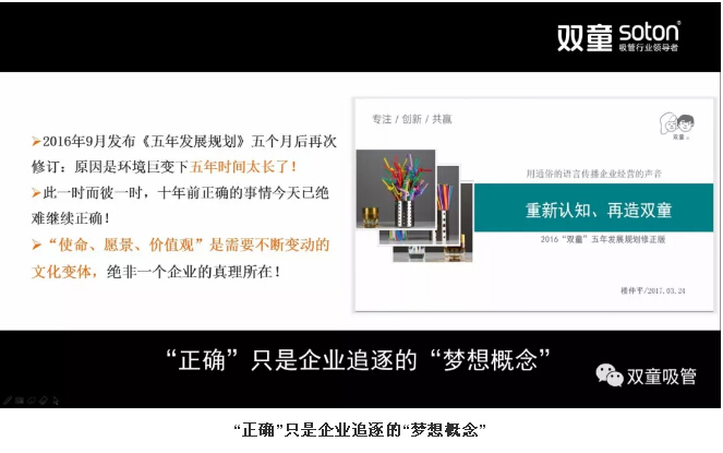“雙童”在五年發(fā)展規(guī)劃中也是基于不斷的改變。樓仲平深知組織文化的初期一定是為企業(yè)服務的,一旦成型之后一定程度上封閉了組織思維的進一步開放,因此企業(yè)在每個階段都需要去突破。“雙童”從2005年開始,每五年發(fā)布一個五年發(fā)展規(guī)劃。2016年9月,“雙童”發(fā)布的《五年發(fā)展規(guī)劃》五個月后再次修訂,原因是環(huán)境巨變下五年時間太長了!此一時而彼一時,十年前正確的事情今天已絕難繼續(xù)正確!“使命、愿景、價值觀”是需要不斷變動的文化變體,絕非一個企業(yè)的真理所在!