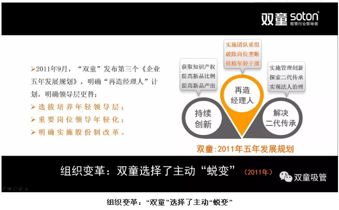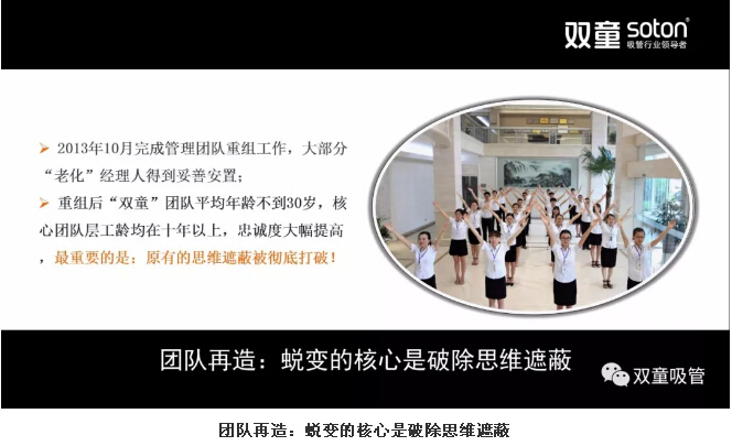 因此,“雙童”選擇了主動“蛻變”,公司在2011年發(fā)布了第三個《企業(yè)五年發(fā)展規(guī)劃》,明確“再造經(jīng)理人”計劃,明確領導層更替:選拔培養(yǎng)年輕領導層、重要崗位領導年輕化、明確實施股份制改革,慢慢解決管理層老化問題!2013年10月,“雙童”完成管理團隊重組工作,大部分“老化”經(jīng)理人得到妥善安置。重組后“雙童”團隊平均年齡不到30歲,核心團隊層工齡均在十年以上,忠誠度大幅提高,最重要的是:原有的思維遮蔽被徹底打破!