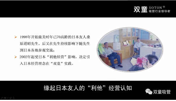 1998年,“雙童”樓仲平通過業(yè)務(wù)關(guān)系結(jié)識(shí)了一位旅美日本友人桑原道昭先生。桑原道昭先生在美國待了45年,會(huì)一點(diǎn)漢語。他會(huì)和樓仲平交流做生意的看法,并用日本人的視角和思想解讀節(jié)能環(huán)保、節(jié)約土地、員工關(guān)懷等方面的話題。在交流過程中,32歲的樓仲平與當(dāng)時(shí)已經(jīng)70歲高齡的桑原道昭先生成為了忘年交,此后便開啟了樓仲平不斷去日本參觀的學(xué)習(xí)之旅。在看過無數(shù)日本企業(yè)對(duì)自然環(huán)境、資源循環(huán)利用等方面的做法后,日本“利他”經(jīng)營的管理理念深深影響了樓仲平的商業(yè)思維。于是,當(dāng)2003年新建廠房的機(jī)會(huì)來臨,樓仲平便立志要將“雙童”建設(shè)為一個(gè)生態(tài)、環(huán)保、無污染、無排放的花園式工廠。