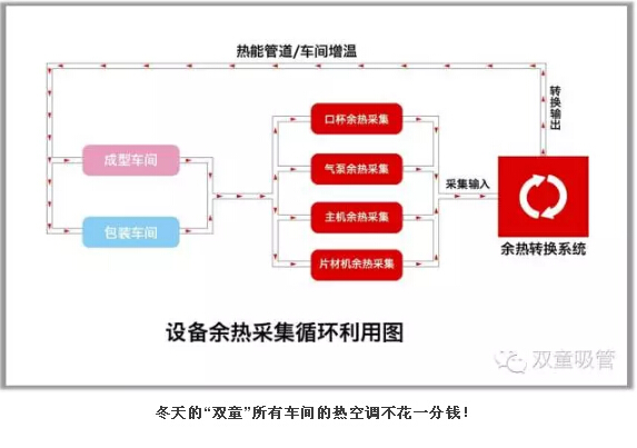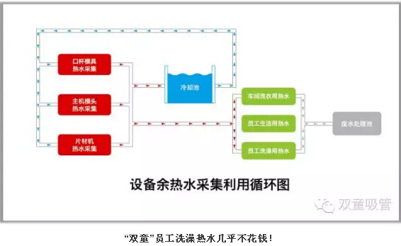 設(shè)備余熱水采集和設(shè)備余熱采集循環(huán)系統(tǒng):“雙童”對(duì)所有經(jīng)過模具的50度溫水進(jìn)行收集,處理之后供應(yīng)到所有寢室衛(wèi)生間給員工洗澡洗衣生活之用。同時(shí),“雙童”也引進(jìn)日本技術(shù)對(duì)所有生產(chǎn)設(shè)備的余熱和廢氣進(jìn)行采集并回收,再通過空調(diào)管道輸送到需要加溫的各個(gè)車間和工段。通過上述方式,“雙童”光是在余熱水采集和設(shè)備余熱采集方面,每年就節(jié)省了150多萬元,消滅了企業(yè)產(chǎn)生的污染和排放!