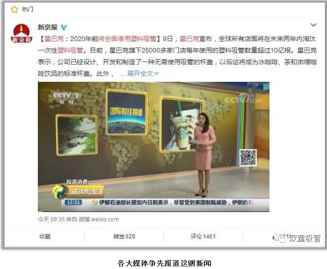 昨天下午,一則#星巴克將全面停用塑料吸管#的話題迅速登上了微博熱搜榜!中國日報、新京報、第一財經(jīng)日報等各大官V不斷跟進這個話題,連央視也發(fā)了新聞,可謂是一“管”激起千層浪!