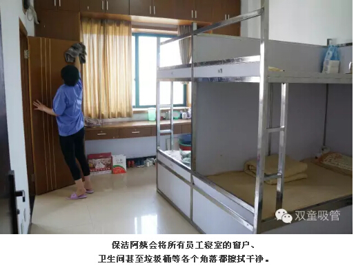 “雙童”員工集體寢室的不銹鋼床架可是參觀團(tuán)隊(duì)最津津樂道的話題之一!這些床架都是由“雙童”樓仲平自行設(shè)計(jì),在建造之初就把床架焊在地上。這樣一來,即避免產(chǎn)生垃圾死角,床下又多了一個(gè)封閉的儲(chǔ)物空間,確保員工在生活方面的便利舒適!