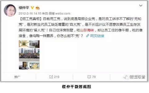 其實(shí),“雙童”樓仲平由于早年坎坷辛苦的創(chuàng)業(yè)經(jīng)歷,一直對(duì)農(nóng)民工感同身受,十分注重員工的吃住問題。早在2012年,樓仲平就發(fā)布了一條關(guān)于員工住宿的微博,引起了極大的關(guān)注。微博上寫道:自己住洋房別墅,卻讓員工住的像牛棚狗窩,你怎么能留得住員工?員工是企業(yè)的基礎(chǔ),對(duì)員工更好、企業(yè)反而會(huì)獲得更多!