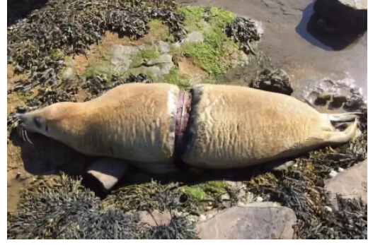 被塑料打包環(huán)死死套住的海豹,