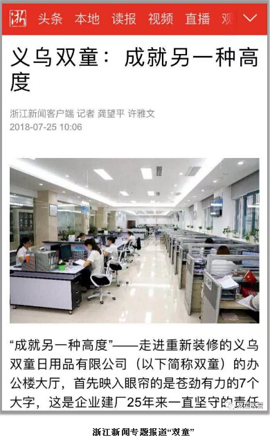 “成就另一種高度”——走進(jìn)重新裝修的義烏雙童日用品有限公司(以下簡稱“雙童”)的辦公樓大廳,首先映入眼簾的是蒼勁有力的7個大字,這是企業(yè)建廠25年來一直堅守的責(zé)任和使命。