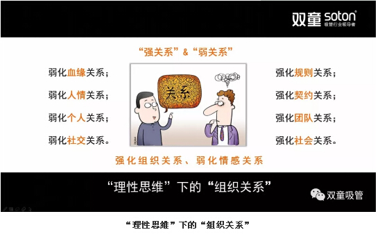 在“理性思維”的影響和推動下,“雙童”創(chuàng)立了一套組織關系哲學:弱化血緣關系,強化規(guī)則關系;弱化人情關系,強化契約關系……從而突破“道德”認知、回歸“理性”本源!