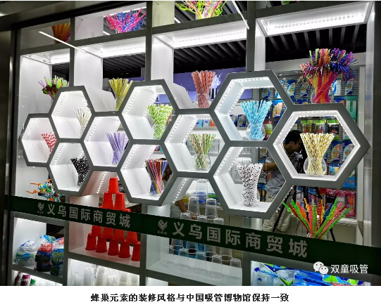 而商鋪的四周,則是各式各樣的吸管組成的“吸管墻”。在商鋪外的客人也可以通過透明玻璃看到吸管產品。在燈光效果下,這些似乎閃耀著光芒的吸管通過不同的形態(tài)展示出超乎想象的美感,讓前來采購的客人看花了眼!