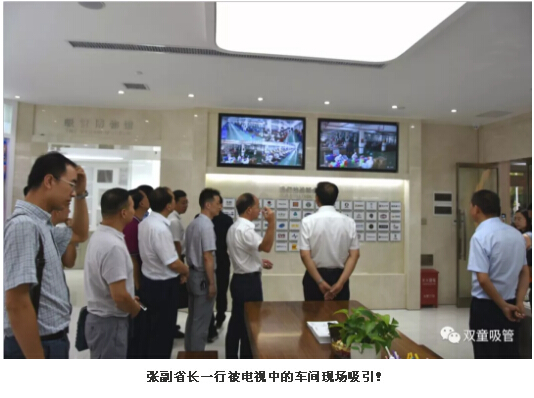 來到“雙童”吸管產(chǎn)品陳列廳時,張副省長一行被墻面上的兩臺大屏三星液晶電視吸引。原來,這兩臺電視機(jī)上連接著車間的監(jiān)控端,讓客戶在不進(jìn)入車間的前提下也能了解到“雙童”的車間生產(chǎn)狀況!對于這樣的“神”操作,張副省長也給了個大大的贊!