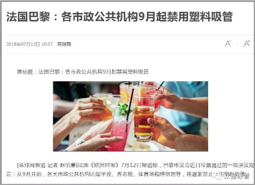 法國《歐洲時報》報道稱,巴黎市議會投票通過的一項決議規(guī)定:從9月開始,各大市政公共機(jī)構(gòu)比如學(xué)校、養(yǎng)老院、體育場和博物館等,將逐漸禁止使用塑料吸管。