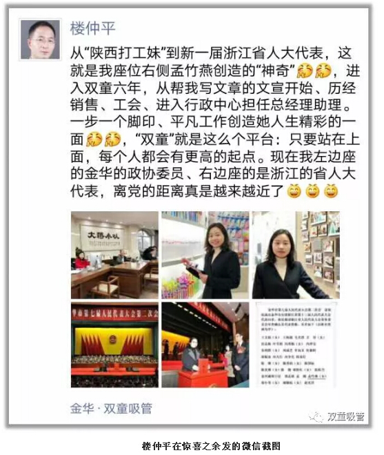 孟竹燕當(dāng)選為浙江省人大代表,對(duì)于所有的“雙童”人來講都很驚喜。孟竹燕也表示: 沒想到我一個(gè)平凡的農(nóng)民工會(huì)被選舉為浙江省人大代表。其實(shí)我也只是盡了自己工作的本分,在公司里把事情做好而已。我非常感謝組織的考察和信任,感謝樓總和李總的多年培養(yǎng)和認(rèn)可,感謝所有同事的支持和幫助。很幸運(yùn)與‘雙童’結(jié)緣,榮譽(yù)的獲得對(duì)自己更是一種前進(jìn)的鞭策,今后我將嚴(yán)以律己,立足于本職工作,用實(shí)際行動(dòng)貫徹好十九大精神,做好農(nóng)民工的代言人!