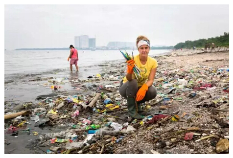 綠色和平組織公益人士Sarah King在海邊收集塑料吸管。