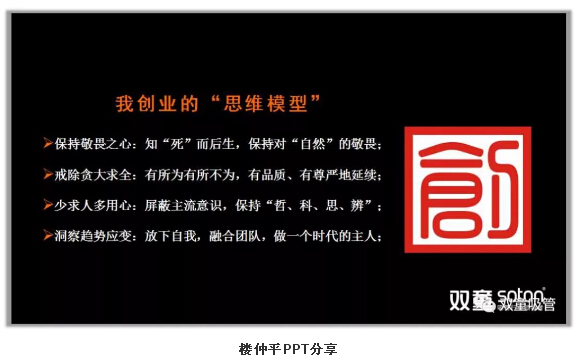 接著,樓仲平用一句話做展開:知“死”而后生。一個企業(yè)唯有始終保持危機(jī)感,才能不斷的成長,否則隨時會死掉。我們所有的一切都在大自然的規(guī)律中,在宇宙之下演繹生成。而商業(yè)的本質(zhì)也是基于自然生態(tài)共生規(guī)律下,所以在經(jīng)營當(dāng)中,唯有大家知道了規(guī)律,才會更進(jìn)一步成長。