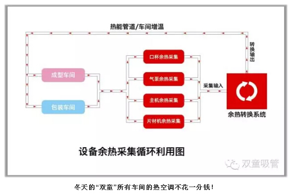 “雙童”對所有經過模具的50度溫水進行收集,處理之后供應到所有寢室衛(wèi)生間給員工洗澡洗衣生活之用。同時,“雙童”對所有生產設備的余熱和廢氣進行采集并回收,再通過空調管道輸送到需要加溫的各個車間和工段。通過上述方式,“雙童”光是在余熱水采集和設備余熱采集方面,每年就節(jié)省了150多萬元,消滅了企業(yè)產生的污染和排放!