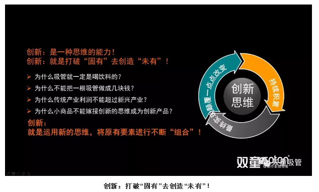 現(xiàn)在,不少人動不動就喊要創(chuàng)新,但是到底什么是創(chuàng)新?我一直理解創(chuàng)新工作的本質在于“思維創(chuàng)新”,就是運用新的思維,將原有要素進行不斷“組合”,打破“固有”創(chuàng)造“未有”。只有用創(chuàng)新思維去做產品、做事業(yè),才能改變自己乃至于整個企業(yè)的命運!