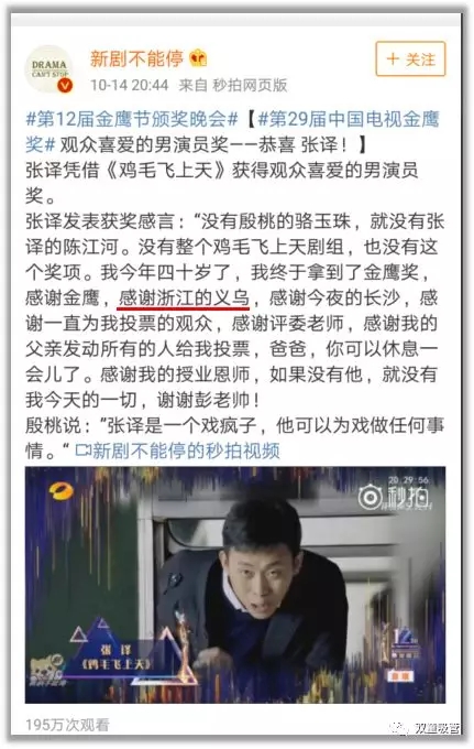 喜報(bào)!在昨天晚上的第29屆中國(guó)電視金鷹獎(jiǎng)?lì)C獎(jiǎng)晚會(huì)上,講述義烏人創(chuàng)業(yè)故事的電視劇《雞毛飛上天》成為了最大贏家,一舉斬獲了“觀眾喜愛的男演員獎(jiǎng)”、“優(yōu)秀電視劇獎(jiǎng)”和“最佳編劇獎(jiǎng)”!在男主角張譯上臺(tái)領(lǐng)獎(jiǎng)時(shí),激動(dòng)地稱:“感謝浙江的義烏!”