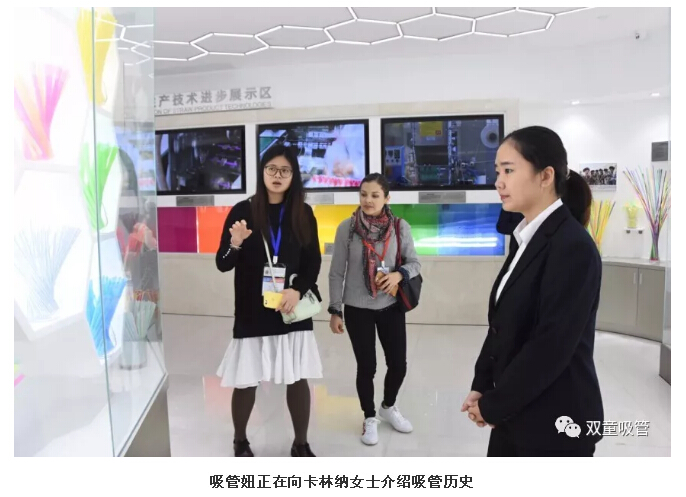 首先,卡林納女士等一行人來到了中國吸管博物館,吸管妞向卡林納女士詳細(xì)介紹了吸管產(chǎn)品的“前世今生”,并展示了博物館內(nèi)各個時期及各種材質(zhì)的吸管,從最早4000多年前的就開始使用的秸稈吸管到紙吸管、塑料吸管......卡林納女士認(rèn)真聆聽,不時點頭表示認(rèn)可。