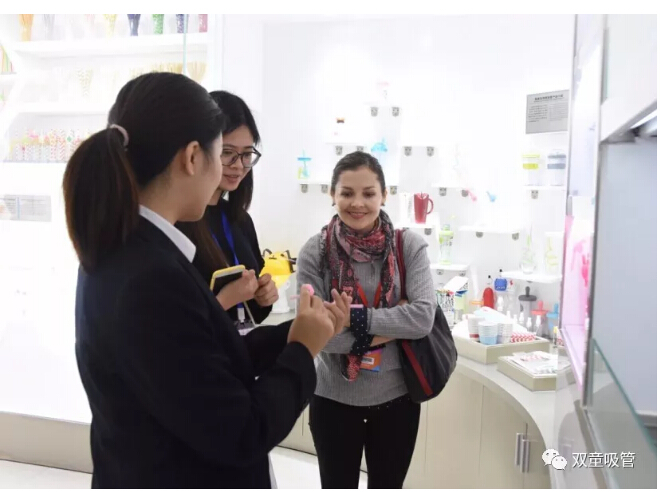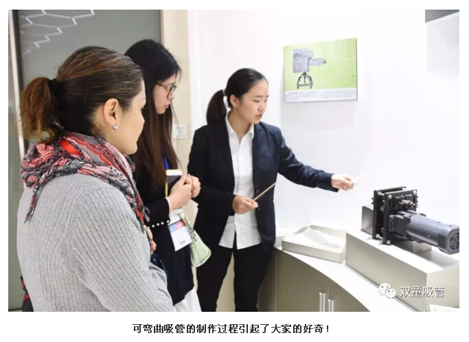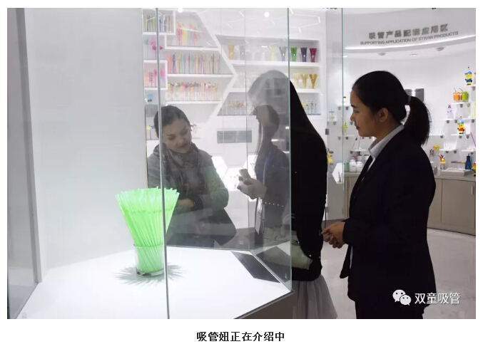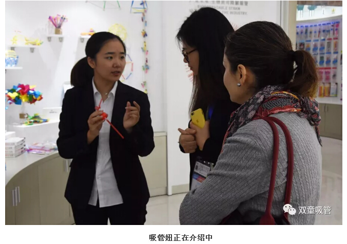 接著,卡林納女士被“雙童”創(chuàng)新產(chǎn)品體驗區(qū)的產(chǎn)品吸引住了,在聽了吸管妞對卡通吸管、小鳥吸管、眼鏡吸管、愛心吸管、哈哈吸管的一番介紹后,她也是覺得十分的不可思議,一根吸管竟能玩出這么多的花樣!