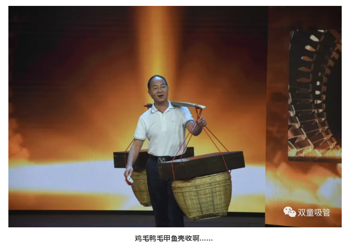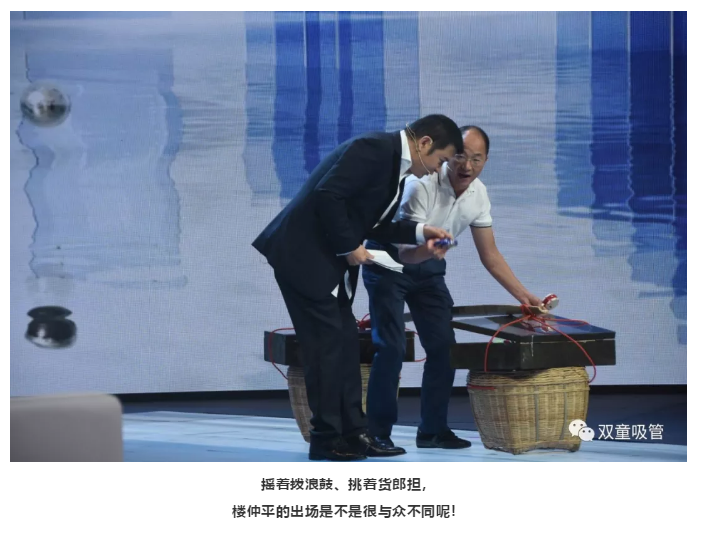 相比于其他兩位嘉賓,“雙童”樓仲平的出場方式可算是最“與眾不同”啦!看,當(dāng)主持人“鷗哥”邀請樓仲平出場時(shí),他竟然搖著撥浪鼓、挑著貨郎擔(dān),口里還喊著“雞毛鴨毛甲魚殼收啊……”就上場了!