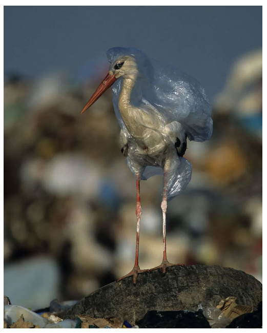 一只鸛周身被塑料袋纏繞,擺脫不得,