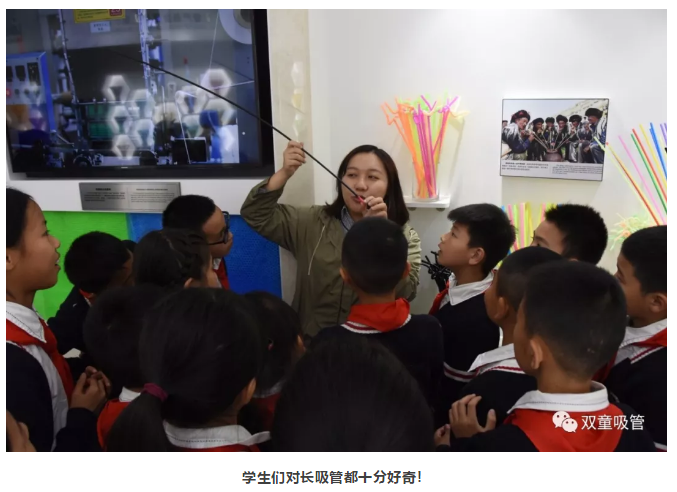 進入吸管博物館后,琳瑯滿目的吸管讓孩子們十分歡喜,大家?guī)е鴿M滿的好奇心緊跟吸管妹妹身后,深怕錯過了關于吸管的“秘密”!來到長吸管區(qū)域時,“超長吸管”更是讓孩子們驚奇不已:“原來還有這么長的吸管呀!”