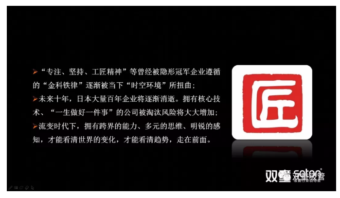 樓仲平分享道:“工匠精神”來源于日本,是一種骨子里的敬業(yè)和守業(yè)精神。它是日本民族中人格文化的體現(xiàn),完全靠學(xué)是學(xué)不會的?!肮そ尘瘛眰魅胫袊?,通過政府、社會的推動已經(jīng)成為一種口號、一項運動、一種共識。我們要意識到任何一項事物一旦被社會所號召,如果創(chuàng)業(yè)者沉迷其中,就沒有企業(yè)經(jīng)營中的差異化所在。
