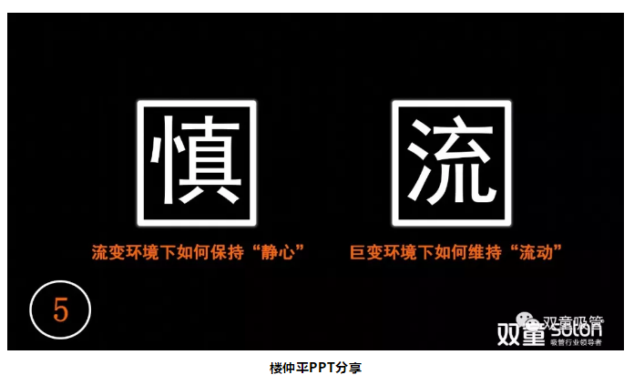 第二個字是“流”。在高速變化的時代,資源和信息高速流變,人才高度流動……在這樣的大環(huán)境下,企業(yè)發(fā)展呈現(xiàn)出一種不可預(yù)測的情況。作為行業(yè)細分的領(lǐng)先企業(yè),你應(yīng)該通過主動的方式、迎合的方式、應(yīng)變的方式、創(chuàng)新的方式,從而保持企業(yè)有序流動,保持創(chuàng)新。