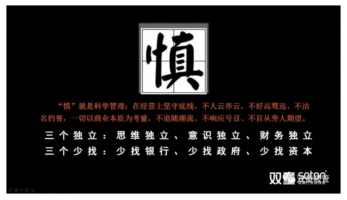 “慎”也是科學(xué)管理的本真,我們要有自己獨立的意識,要有自己獨立的思維,在經(jīng)營上要有自己的獨立判斷,堅守底線,不人云亦云,一切以商業(yè)本質(zhì)為考量,不追隨潮流、不響應(yīng)號召、不盲從旁人期望?;谝陨?,我總結(jié)出“三個獨立”和“三個少找”: