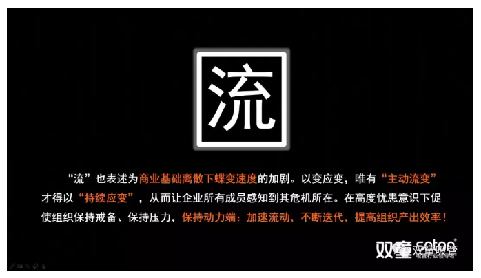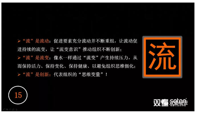 “流”在更深層次上也可以理解為創(chuàng)新,它代表組織的“思維變量”。它是在商業(yè)基礎(chǔ)流變下迭代速度的加速,我們要以變應(yīng)變,用“主動流變”去維持“持續(xù)應(yīng)變”,從而讓企業(yè)所有成員感知到其危機所在。在高度憂患意識下,“流”促使了組織保持戒備、保持壓力,加速流動,不斷迭代,從而提高組織的產(chǎn)出效率!